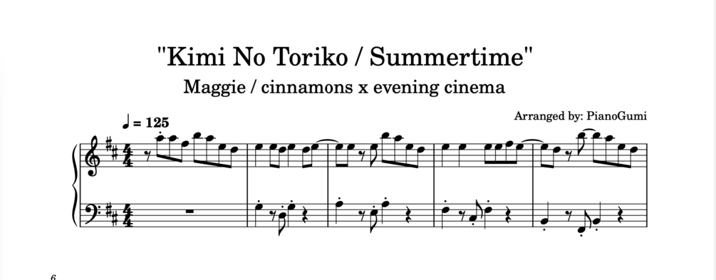Easy piano arrangement of "Kimi No Toriko / Summertime" by cinnamons x evening cinema then covered by Maggie x Nyan.
