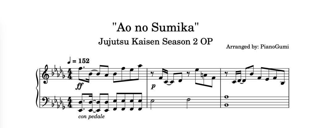 Medium/Intermediate piano arrangement of Jujutsu Kaisen Season 2 OP - "Ao no Sumika".